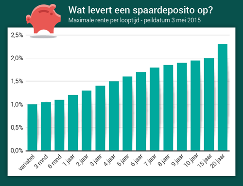 Nu de spaarrentes laag zijn, brengt echter ook een deposito niet veel op. Rabobank biedt het meest: als je je geld voor 20 jaar bij Rabobank parkeert, ben je verzekerd van 2,3% rente. Dat is flink meer dan de huidige rente op een gewone spaarrekening. Je kunt echter tot medio 2036 niet meer bij je geld. En dat nadeel zal voor de meeste mensen niet opwegen tegen de hogere rente.