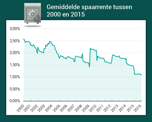 De gemiddelde spaarrente is de afgelopen jaren flink gezakt. In de eerste vijftien jaar van deze eeuw, ontving je gemiddeld 1,88% rente op een standaard spaarrekening. Dat is grofweg het dubbele van wat je nu ontvangt. Ten minste, als je bij een van de top 10 aanbieders spaart en niet bij ABN AMRO, ING of Rabobank.