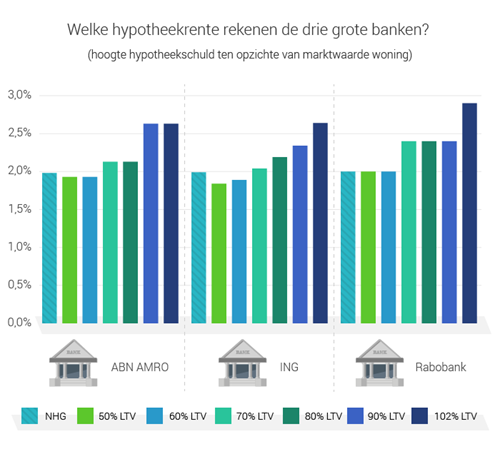 De meeste banken rekenen met risicoklassen in stappen van vijf procent van de woningwaarde. Niet iedere klasse heeft direct een ander rentetarief, dat verschilt per bank. Deze precieze voorwaarden verschillen per aanbieder én per hypotheekcontract. Een voorbeeld van de huidige rentetarieven van de drie grote banken: