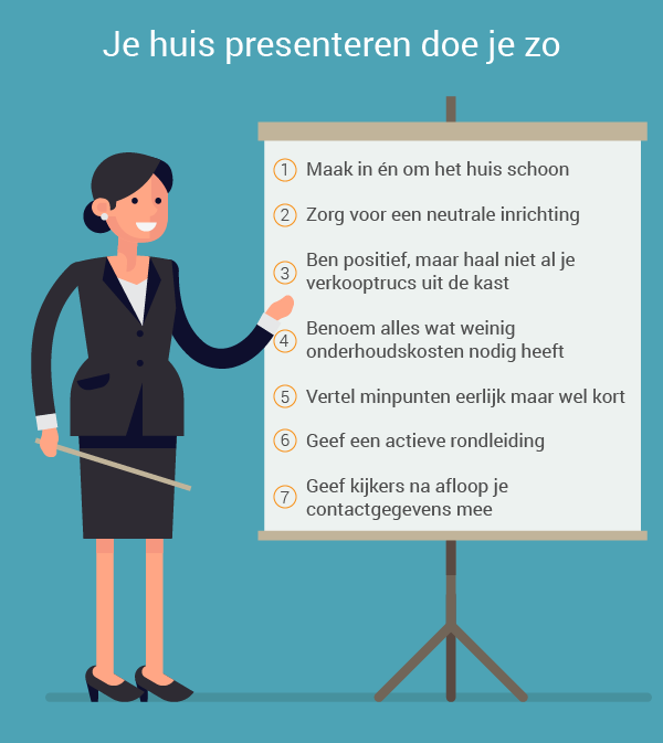 Als verkoper ben je uiteraard positief over het huis waar je vanaf wilt. Overstelp de kijkers niet meteen met al je verkooptrucs. Zo is het niet nodig om bij iedere ruimte alle voordelen meerdere keren te benadrukken. Dit komt al snel opdringerig over en blijft bij de kijker toch niet hangen. Vertel liever waarom je er altijd met veel plezier hebt gewoond, maar waarom je nu toch gaat verhuizen.