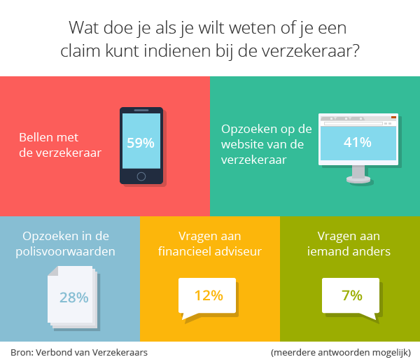 Of een verzekeraar de schade vergoedt, moet dan blijken uit een telefoontje met de maatschappij  (59%) of via een speurtocht op de website van de verzekeraar (41%). Slechts 28% slaat zelf de polisvoorwaarden open.