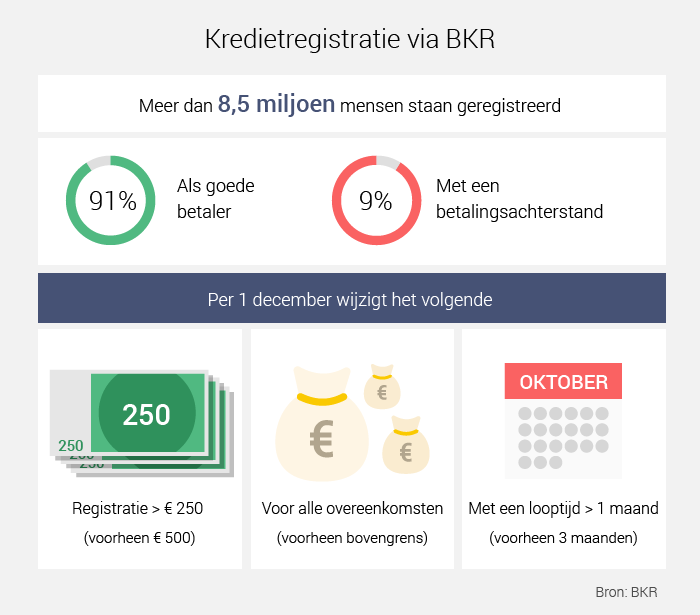 Voorheen had je alleen een BKR-registratie bij kredieten boven € 500 met een looptijd van meer dan 3 maanden. Zowel het bedrag als de looptijd gaat nu omlaag. Voortaan heb je al een registratie bij een krediet vanaf € 250, met een looptijd van een maand.