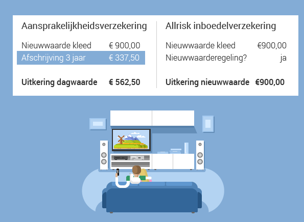 Op maandag bel je met je aansprakelijkheidsverzekering. Hoewel er dekking is, sturen die je eerst door naar je vrienden om te vragen of zij wellicht een allrisk inboedelverzekering hebben. Omdat ze die hebben, wordt de schade daar geclaimd. Dat scheelt je vrienden € 337,50. Omdat de AVP meteen drie jaar had afgeschreven, terwijl de inboedelverzekering nog de nieuwwaarde uitkeert.