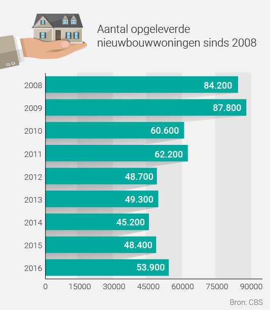 In 2009 werden er nog 87.800 woningen bijgebouwd. Daar zitten we in 2016 bijna 39 procent onder. Nederland heeft die huizen wel nodig. De bevolking groeit en het aantal personen per huishouden wordt gemiddeld kleiner. Daar is de huidige woningvoorraad niet op ingericht. Nog los van het feit dat er ook elk jaar woningen gesloopt worden.