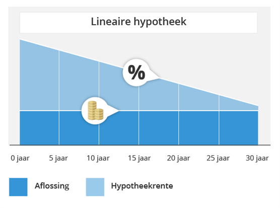 Stel, je hebt een lineaire hypotheek van € 200.000. Dan betaal je aan aflossing elke maand € 555,56. Daar bovenop komt nog de rente. Dit bedrag hangt af van het percentage hypotheekrente. Elk jaar los je afgerond € 6.667 af. Na 15 jaar heb je 50% van je hypotheek afgelost.