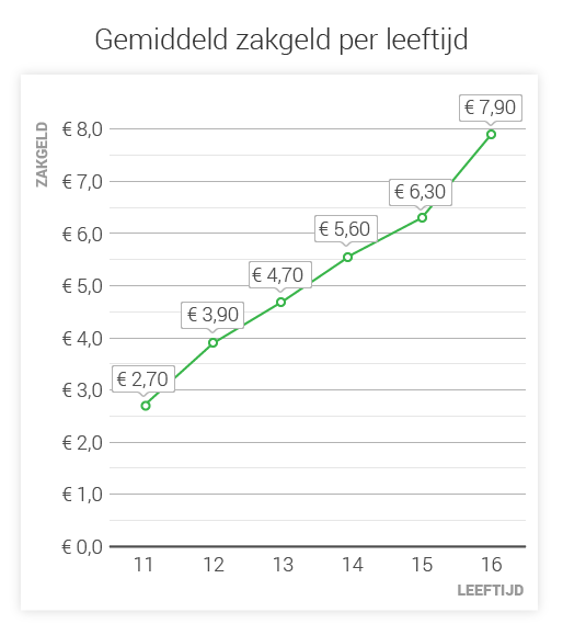 Ruim 91% krijgt wekelijks een vast bedrag van zijn ouders. Is een kind 11 jaar, dan is dat gemiddeld € 2,70. Dit loopt met stappen op naar € 7,90 voor 16-jarigen. Kleedgeld ligt tussen de € 40 en € 65 per maand. Geen grote bedragen, wel voldoende om je kinderen te laten wennen aan een financiële huishouding.