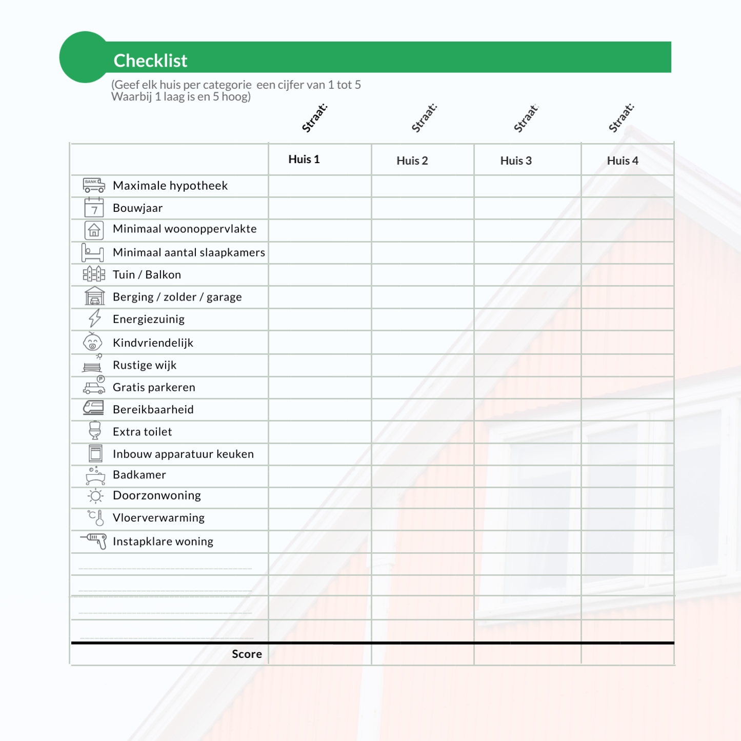 Voor de bezichtiging zelf kan je de onderstaande checklist downloaden. Hierop kan je per onderdeel een cijfer geven, zodat er een goede vergelijking mogelijk is. Naast kenmerken als het aantal kamers en het woningoppervlakte bevat de lijst ook zaken als de kindvriendelijkheid van de buurt en parkeergelegenheid.