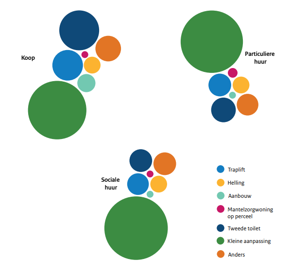 Als we kijken naar de grotere aanpassingen zijn er de nodige verschillen tussen kopers en huurders. In koopwoningen kom je eerder een extra toilet tegen. Daarnaast is in koopwoningen vaker een traplift aanwezig. Het laatste komt mede door het grotere aandeel gelijkvloerse appartementen in de huursector. Als woningeigenaar heb je meer zeggenschap over het aanpassen van je woning. Niet verwonderlijk dat koopwoningen vaker een aanbouw krijgen, om zo op één verdieping te kunnen wonen.