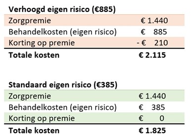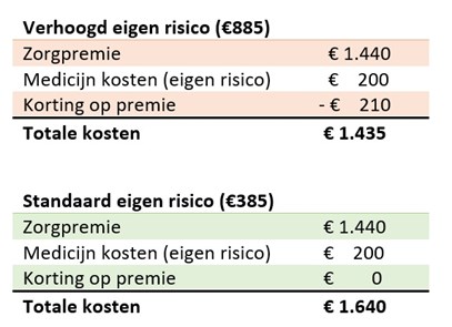 Dat je dit jaar gezond bent gebleven, geeft helaas geen garantie voor komend jaar. Het is dan ook niet mogelijk om exact uit te rekenen of het verhogen van je eigen risico verstandig is. Wel kunnen we enkele voorbeelden geven van de kosten bij een wel of niet verhoogd eigen risico. Daarbij gaan we uit van een vaste premie van 120 euro per maand met een verplicht eigen risico van €385. Wat betreft het verhoogde risico rekenen we met een korting van €17,50 per maand op de zorgpremie.