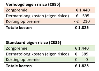 Jolien heeft de afgelopen jaren vrijwel nooit kosten gemaakt die onder haar eigen risico vallen. Ze kiest ieder jaar voor het maximale eigen risico. Dit jaar moest ze naar de dermatoloog voor een verdacht plekje op haar huid. De rekening: circa €595. Deze kosten vallen onder haar eigen risico. Ondanks de onverwachte kosten speelt Jolien toch quitte.