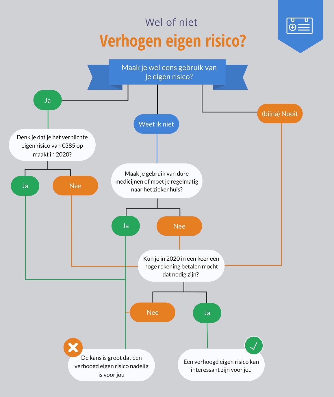 Het verhogen van je eigen risico is doorgaans alleen verstandig als je weinig tot geen zorgkosten maakt. Het onderstaande stappenplan helpt je de keus te maken voor wel of niet verhogen: