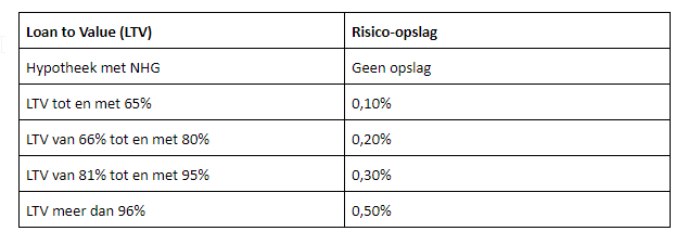 Hypotheekverstrekkers houden rekening met een bepaald risico bij het afsluiten van een hypotheek. Leen je meer, dan loopt de bank in principe een hoger risico en betaal je meer (opslag). Bij het berekenen van de exacte risico-opslag kijken banken naar de verhouding tussen de hoogte van de hypotheek en de woningwaarde. Deze verhouding wordt ook wel Loan to Value (LTV) genoemd. Hoe hoger de LTV des te hoger de risico-opslag.