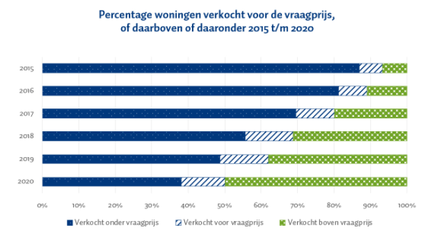 In opdracht van het ministerie van Binnenlandse Zaken hebben het Centraal Bureau van Statistiek (CBS) en het Kadaster onderzoek gedaan naar de spanningsindicatoren op de woningmarkt. Overbieden op een woning is de norm geworden, zo blijkt uit cijfers over de periode van 2015 tot 2020. In 2015 werd slechts 7% boven de vraagprijs verkocht. In 2020 was dat maar liefst de helft van de woningen. Zo zag die verschuiving er in beeld uit: