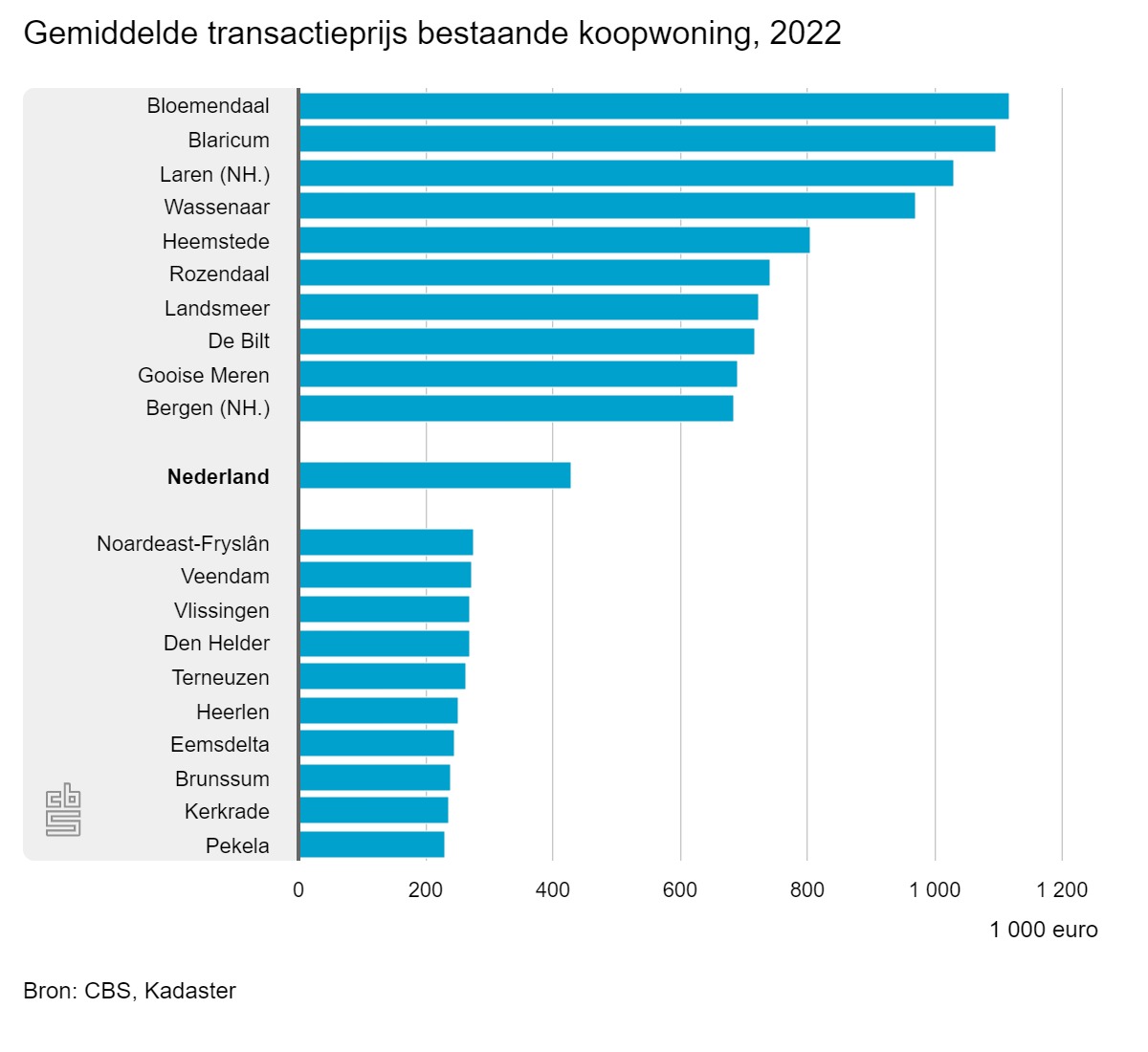 Op papier ben je als huizeneigenaar flink rijker geworden in 2022. De gemiddelde verkoopprijs van bestaande woningen lag bijna € 42.000 hoger dan in 2021. Reken jezelf niet direct rijk, want van de ‘winst’ is al een deel af. Daarnaast maakt het ook nogal een verschil of je in Bloemendaal woont of in Pekela.