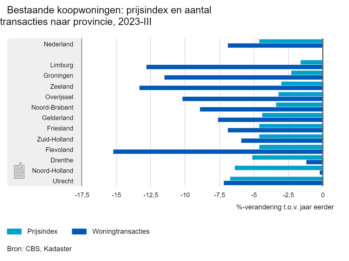 In vergelijking met het derde kwartaal vorig jaar zijn de woningprijzen in het derde kwartaal van 2023 met 4,6% gedaald. In elke provincie daalde de woningprijs. In Utrecht (6,7%) was de daling het sterkst. Woningeigenaren in Limburg kwam er het best vanaf met een daling van 1,6%.